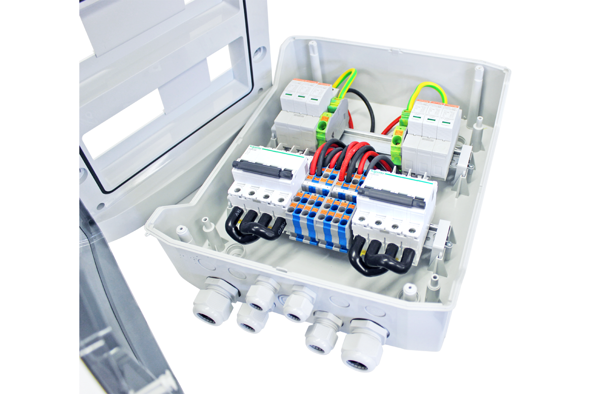 Unser PV Generatoranschlusskasten PushIN mit eingebautem Trennschalter gewährleistet eine allpolige Trennung bei Anschluss und Wartung Ihrer Photovoltaikanlage. Mit Mehrfacheinführungen M32/4 und innovativen Push-IN Klemmen ermöglicht er eine effiziente Installation. Zudem bietet der Anschlusskasten Anschlussmöglichkeiten für 2 Strings pro MPP parallel und verfügt über 2x PE Anschlüsse in einem robusten IP65 Gehäuse.